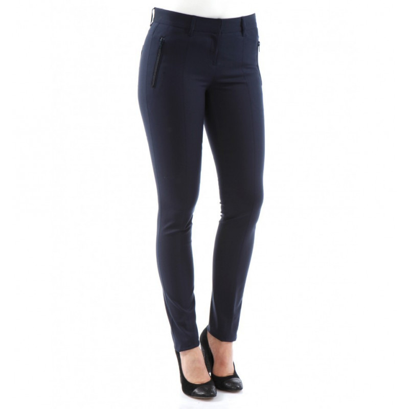 Thin and stretch pants tight on the body in sporty look with its two zipped pockets and visible stitching . Two straight zipped side pockets . Two patch pockets on the back . Zip closure, hooks and buttons. Belt loops . Inseam length size 36 : 80cm . Width size : 14cm . Trousers Composition: 61% cotton, 35 % viscose and 4% elastane .