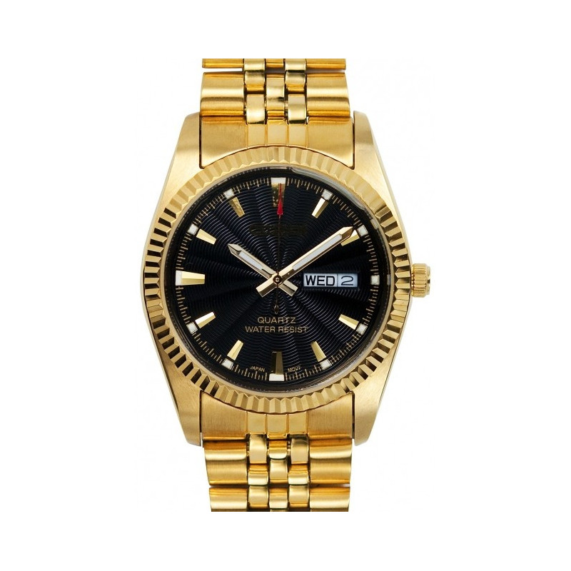 Look for this very 70s Day / Date Citizen Version gold and black background . We love its vintage look very strong for a unique signature look , its wide 35mm, size mat and comfort on the wrist. We are not in the great watchmaking , obviously , but it's a beautiful trendy accessory. It still displays well the time, date and day of the week in English or Japanese. A good choice for those who like to give a touch to his old school look. Dimensions: 35mm wide , high clip to attach 43mm , 8mm thick. Block and stainless steel bracelet . Tinted gold. Adjustable light folding clasp . Quartz movement 1 year warranty.