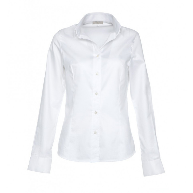 Curved white blouse musketeer wrist. Two front darts and two back darts . Wrist two buttons. French semi-rigid collar. Collar height: 3cm . Length tips : 5.5cm . Back length in size L: approximately 65cm . Length sleeves size L : 63cm . Wrist Width: 6.5cm . Shirt Composition : 100% cotton two-ply.